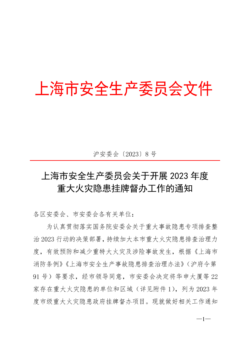 为认真贯彻落实国务院安委会关于重大事故隐患专项排查整治2023行动的决策部署,持续加大本市重大火灾隐患排查治理力度,有效预防和减少重特大火灾及涉险事故发生,根据《上海市消防条例》《上海市安全生产事故隐患排查治理办法》(沪府令第91号)等要求,经市领导同意,市安委会决定将华申大厦等22家存在重大火灾隐患的单位和区域(详见附件1),列为2023年度市级重大火灾隐患政府挂牌督办项目。现就做好相关工作通知如下。
