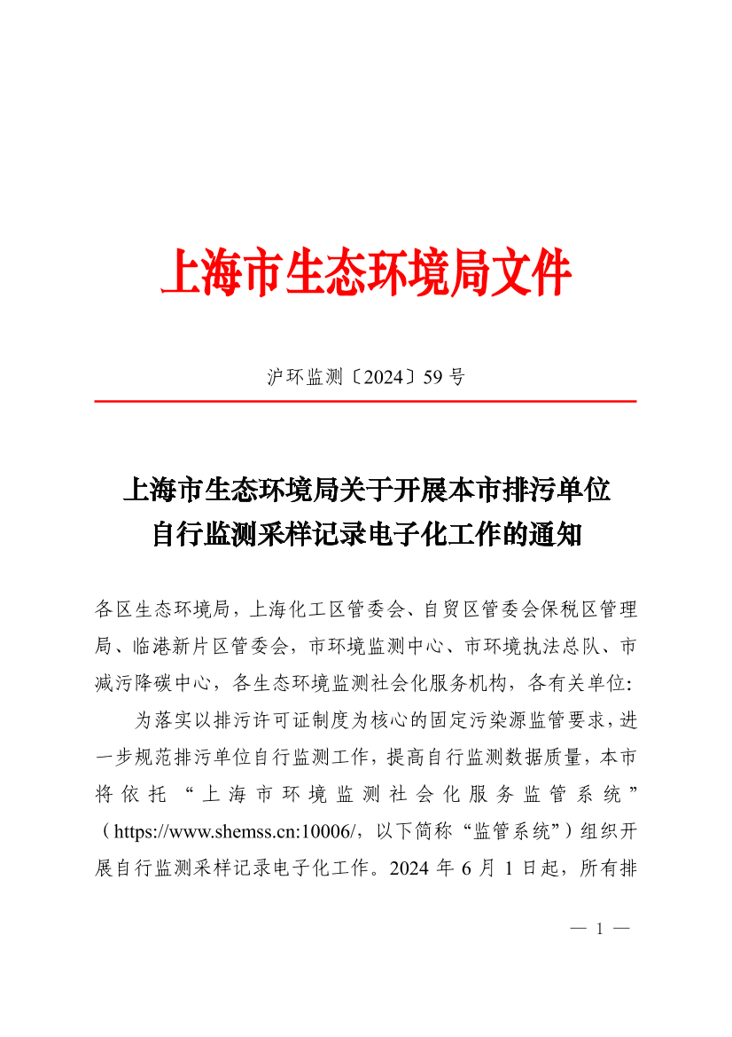 为落实以排污许可证制度为核心的固定污染源监管要求,进一步规范排污单位自行监测工作,提高自行监测数据质量,本市将依托“上海市环境监测社会化服务监管系统”(https://www.shemss.cn:10006/,以下简称“监管系统”)组织开展自行监测采样记录电子化工作。2024年6月1日起,所有排污单位均应对自行监测现场采样工作进行电子化记录。有关工作要求通知如下:
