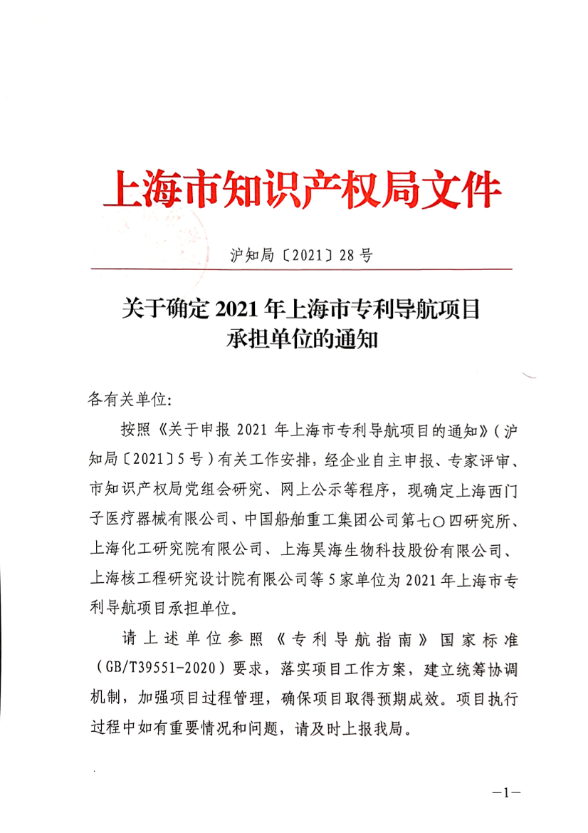 按照《关于申报2021年上海市专利导航项目的通知》(沪知局[2021]5号)有关工作安排,经企业自主申报、专家评审、市知识产权局党组会研究、网上公示等程序,现确定上海西门子医疗器械有限公司、中国船舶重工集团公司第七O四研究所、上海化工研究院有限公司、上海昊海生物科技股份有限公司、上海核工程研究设计院有限公司等5家单位为2021年上海市专利导航项目承担单位。