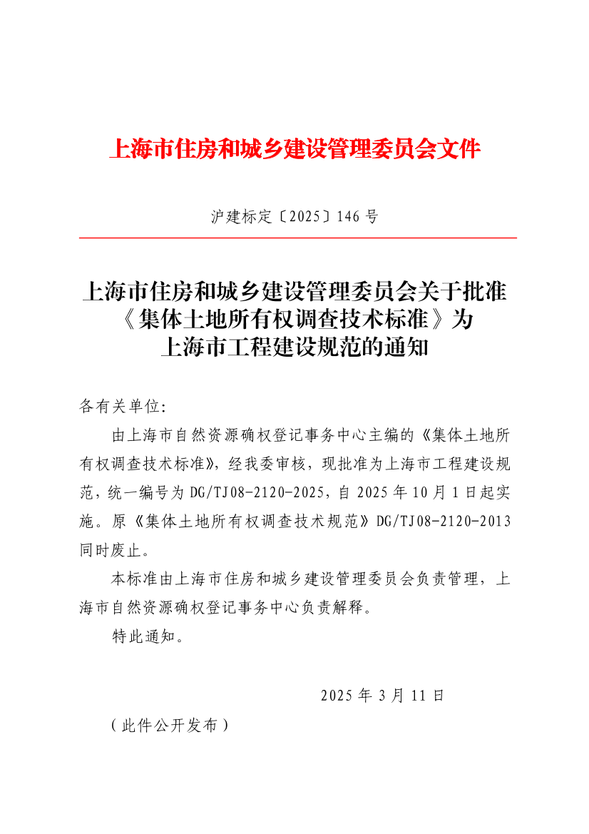 由上海市自然资源确权登记事务中心主编的《集体土地所有权调查技术标准》,经我委审核,现批准为上海市工程建设规范,统一编号为DG/TJ08-2120-2025,自2025年10月1日起实施。原《集体土地所有权调查技术规范》DG/TJ08-2120-2013同时废止。