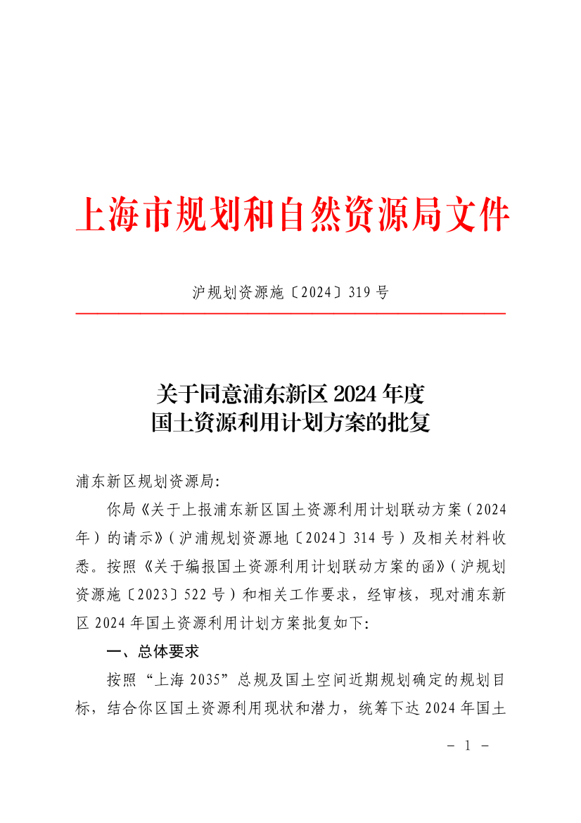 关于同意浦东新区2024年度国土资源利用计划方案的批复