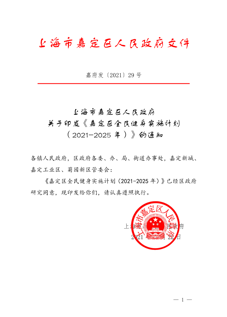 《嘉定区全民健身实施计划(2021-2025年)》已经区政府研究同意,现印发给你们,请认真遵照执行。