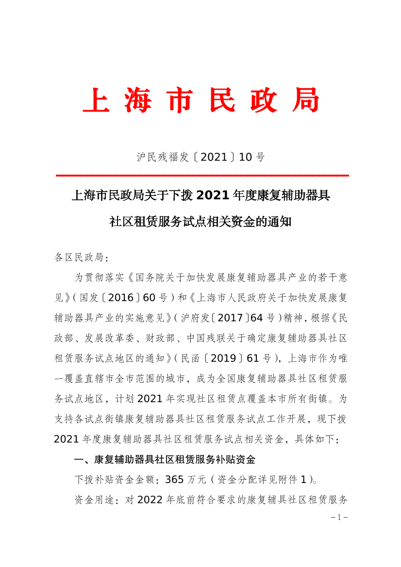 为贯彻落实《国务院关于加快发展康复辅助器具产业的若干意见》(国发〔2016〕60号)和《上海市人民政府关于加快发展康复辅助器具产业的实施意见》(沪府发〔2017〕64号)精神,根据《民政部、发展改革委、财政部、中国残联关于确定康复辅助器具社区租赁服务试点地区的通知》(民函〔2019〕61号),上海市作为唯一覆盖直辖市全市范围的城市,成为全国康复辅助器具社区租赁服务试点地区,计划2021年实现社区租赁点覆盖本市所有街镇。为支持各试点街镇康复辅助器具社区租赁服务试点工作开展,现下拨2021年度康复辅助器具社区租赁服务试点相关资金,具体如下: