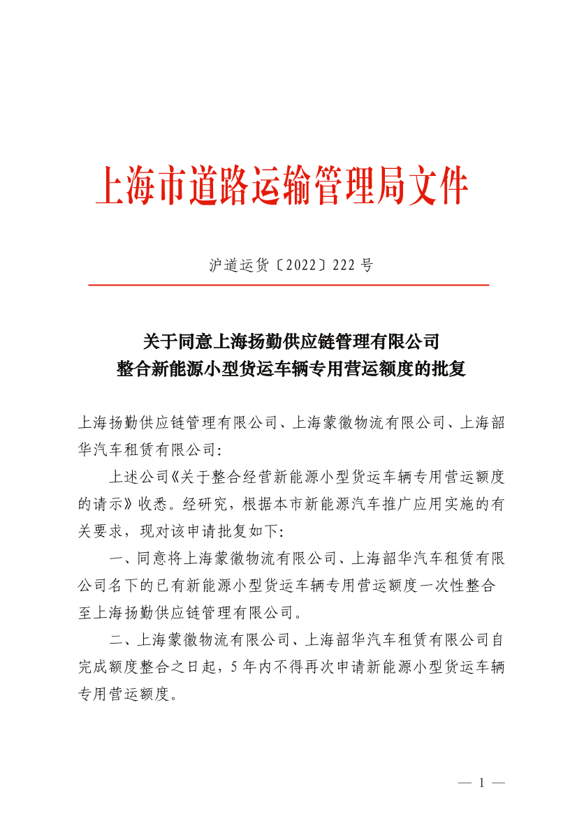 一、同意将上海蒙徽物流有限公司、上海韶华汽车租赁有限公司名下的已有新能源小型货运车辆专用营运额度一次性整合至上海扬勤供应链管理有限公司。