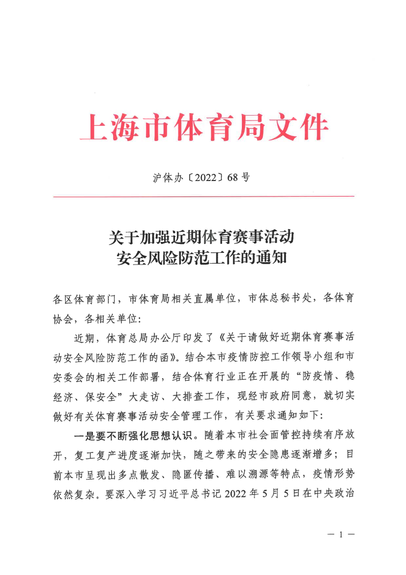 近期,体育总局办公厅印发了《关于请做好近期体育赛事活动安全风险防范工作的函》。结合本市疫情防控工作领导小组和市安委会的相关工作部署,结合体育行业正在开展的“防疫情、稳经济、保安全”大走访、大排查工作,现经市政府同意,就切实做好有关体育赛事活动安全管理工作,有关要求通知如下: