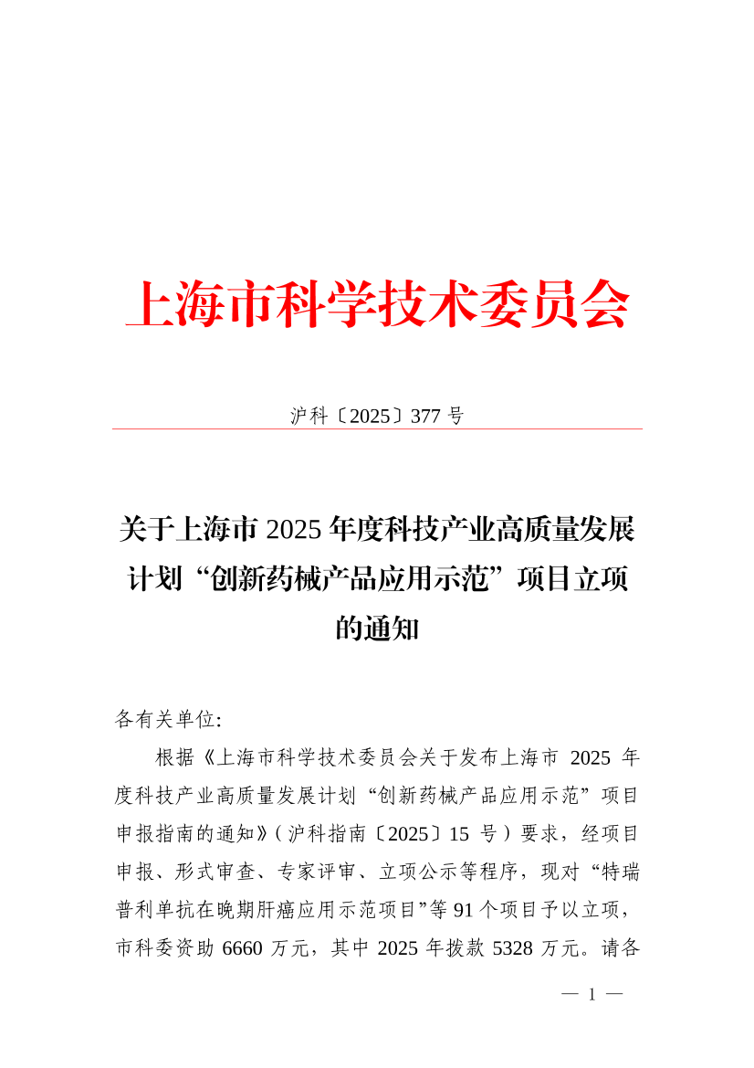 根据《上海市科学技术委员会关于发布上海市2025年度科技产业高质量发展计划“创新药械产品应用示范”项目申报指南的通知》(沪科指南〔2025〕15号)要求,经项目申报、形式审查、专家评审、立项公示等程序,现对“特瑞普利单抗在晚期肝癌应用示范项目”等91个项目予以立项,市科委资助6660万元,其中2025年拨款5328万元。请各项目承担单位做好项目组织实施和管理工作,确保按期完成项目任务目标。