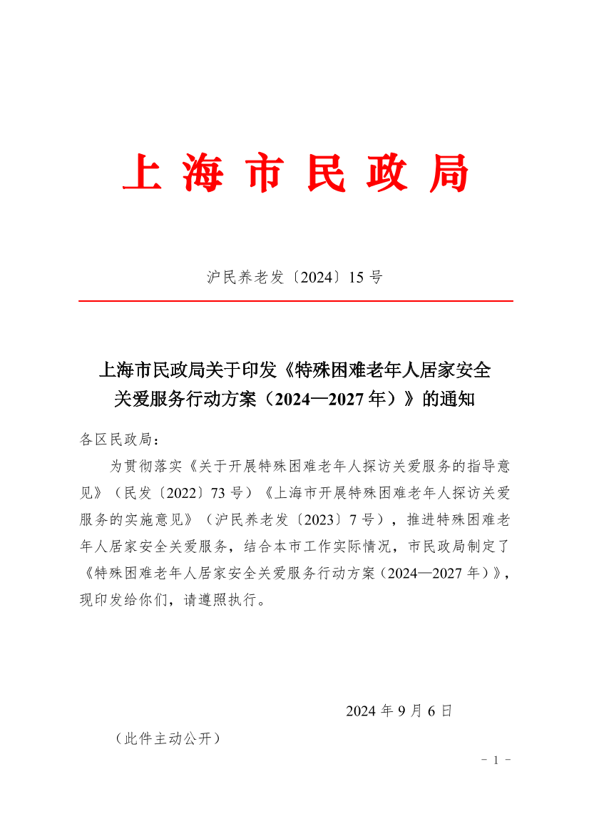 为贯彻落实《关于开展特殊困难老年人探访关爱服务的指导意见》(民发〔2022〕73号)《上海市开展特殊困难老年人探访关爱服务的实施意见》(沪民养老发〔2023〕7号),推进特殊困难老年人居家安全关爱服务,结合本市工作实际情况,市民政局制定了《特殊困难老年人居家安全关爱服务行动方案(2024—2027年)》,现印发给你们,请遵照执行。