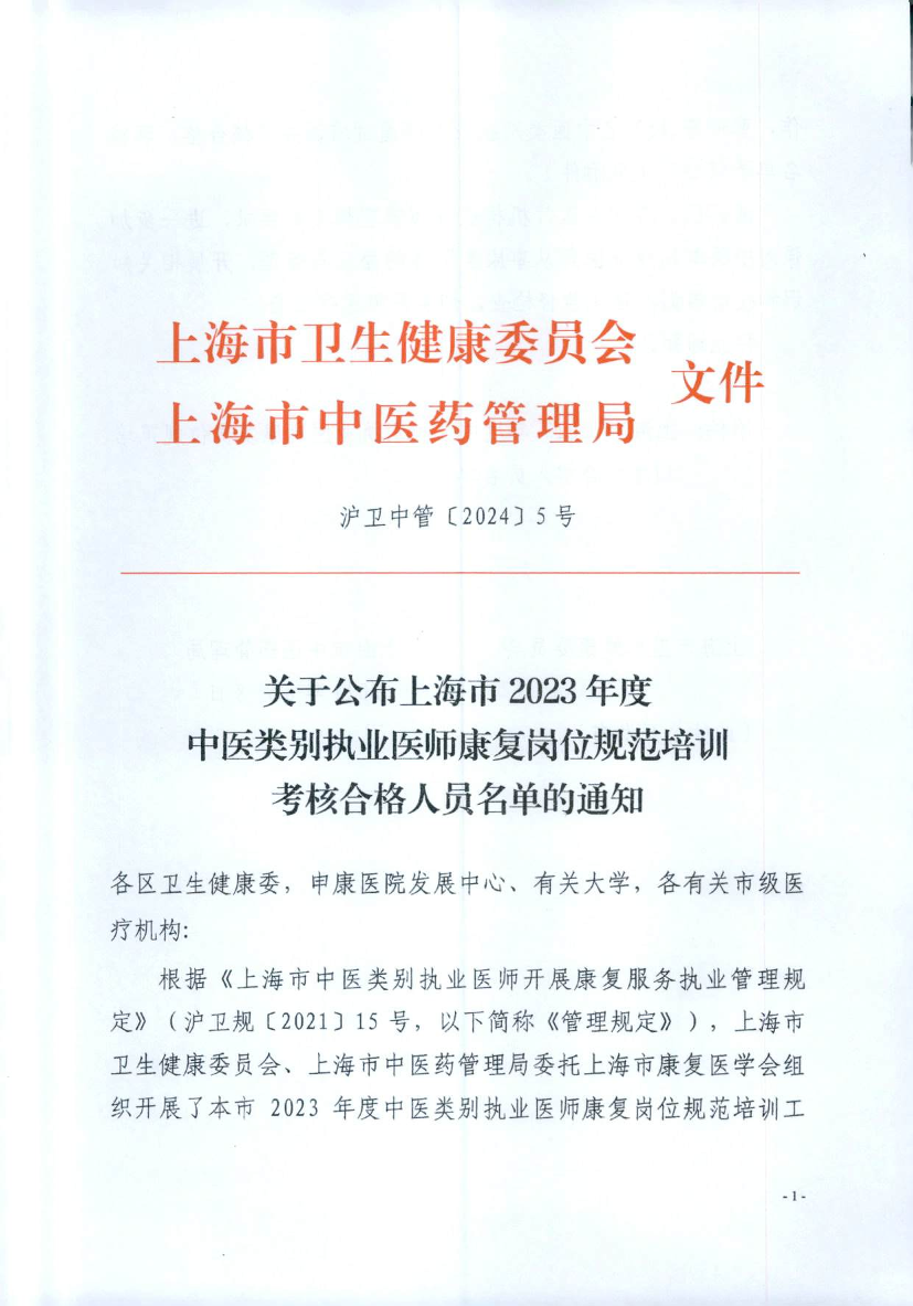 根据《上海市中医类别执业医师开展康复服务执业管理规定》(沪卫规〔2021〕15号,以下简称《管理规定》),上海市卫生健康委员会、上海市中医药管理局委托上海市康复医学会组织开展了本市2023年度中医类别执业医师康复岗位规范培训工作,曹琦等152名中医类别执业医师通过培训并考核合格,现将名单予以公布(见附件)。