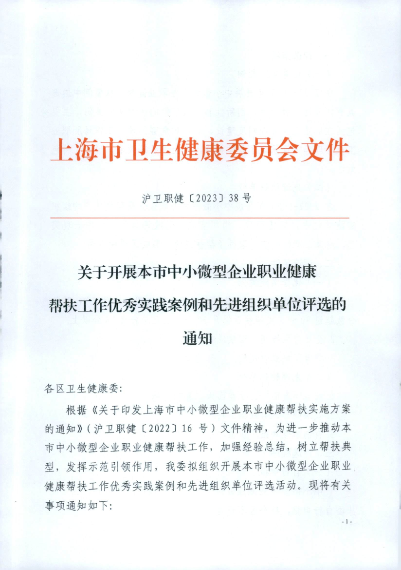根据《关于印发上海市中小微型企业职业健康帮扶实施方案的通知》(沪卫职健〔2022〕16号)文件精神,为进一步推动本市中小微型企业职业健康帮扶工作,加强经验总结,树立帮扶典型,发挥示范引领作用,我委拟组织开展本市中小微型企业职业健康帮扶工作优秀实践案例和先进组织单位评选活动。现将有关事项通知如下: