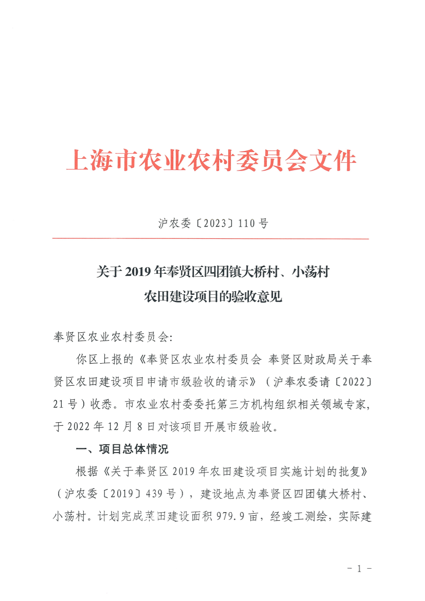 根据《关于奉贤区2019年农田建设项目实施计划的批复》(沪农委〔2019〕439号),建设地点为奉贤区四团镇大桥村、小荡村。计划完成菜田建设面积979.9亩,经竣工测绘,实际建成耕地面积为960.26亩。