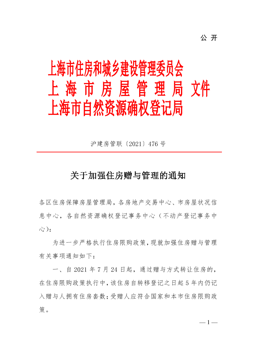 一、自2021年7月24日起,通过赠与方式转让住房的,在住房限购政策执行中,该住房自转移登记之日起5年内仍记入赠与人拥有住房套数;受赠人应符合国家和本市住房限购政策。