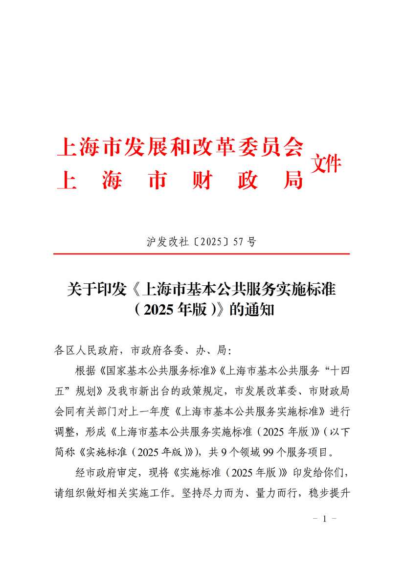 根据《国家基本公共服务标准》《上海市基本公共服务“十四五”规划》及我市新出台的政策规定,市发展改革委、市财政局会同有关部门对上一年度《上海市基本公共服务实施标准》进行调整,形成《上海市基本公共服务实施标准(2025年版)》(以下简称《实施标准(2025年版)》),共9个领域99个服务项目。
