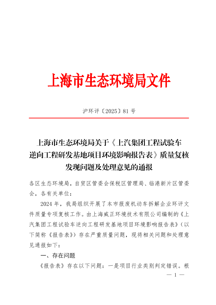 2024年,我局组织开展了本市报废机动车拆解企业环评文件质量专项复核工作。由上海威正环境技术有限公司编制的《上汽集团工程试验车逆向工程研发基地项目环境影响报告表》(以下简称《报告表》)存在严重质量问题,现将相关问题和处理意见通报如下: