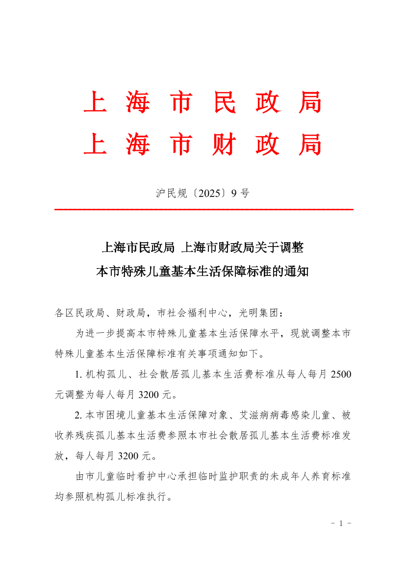 以上标准自2025年1月1日起实施,《上海市民政局 上海市财政局关于调整本市特殊儿童基本生活保障标准的通知》(沪民规〔2023〕5号)同步废止。