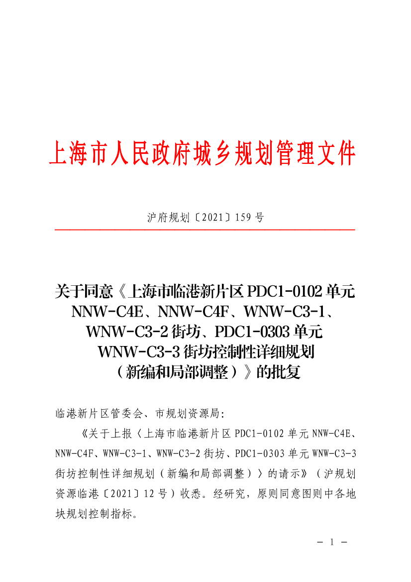 《关于上报〈上海市临港新片区PDC1-0102单元NNW-C4E、NNW-C4F、WNW-C3-1、WNW-C3-2街坊、PDC1-0303单元WNW-C3-3街坊控制性详细规划(新编和局部调整)〉的请示》(沪规划资源临港〔2021〕12号)收悉。经研究,原则同意图则中各地块规划控制指标。