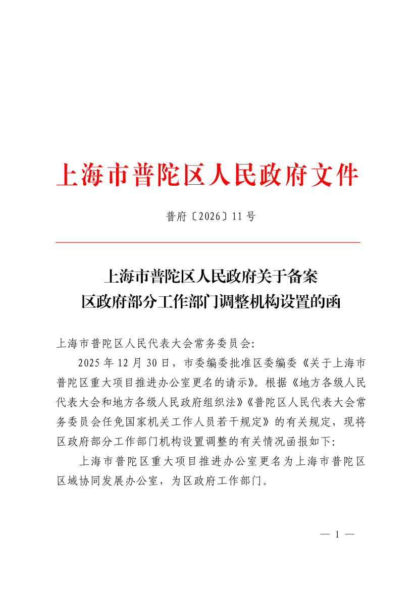 2025年12月30日,市委编委批准区委编委《关于上海市普陀区重大项目推进办公室更名的请示》。根据《地方各级人民代表大会和地方各级人民政府组织法》《普陀区人民代表大会常务委员会任免国家机关工作人员若干规定》的有关规定,现将区政府部分工作部门机构设置调整的有关情况函报如下: