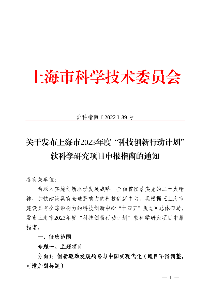 为深入实施创新驱动发展战略,全面贯彻落实党的二十大精神,加快建设具有全球影响力的科技创新中心,现根据《上海市建设具有全球影响力的科技创新中心“十四五”规划》总体布局,发布上海市2023年度“科技创新行动计划”软科学研究项目申报指南。