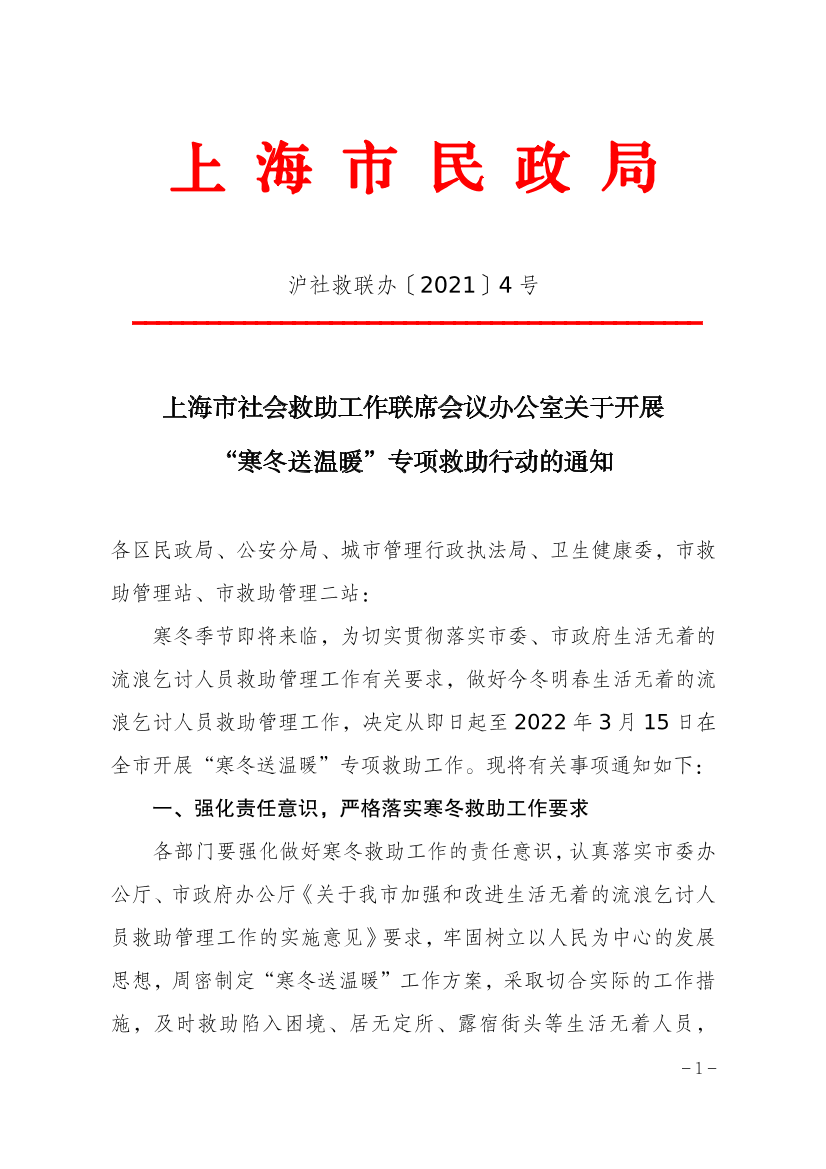 寒冬季节即将来临,为切实贯彻落实市委、市政府生活无着的流浪乞讨人员救助管理工作有关要求,做好今冬明春生活无着的流浪乞讨人员救助管理工作,决定从即日起至2022年3月15日在全市开展“寒冬送温暖”专项救助工作。现将有关事项通知如下: