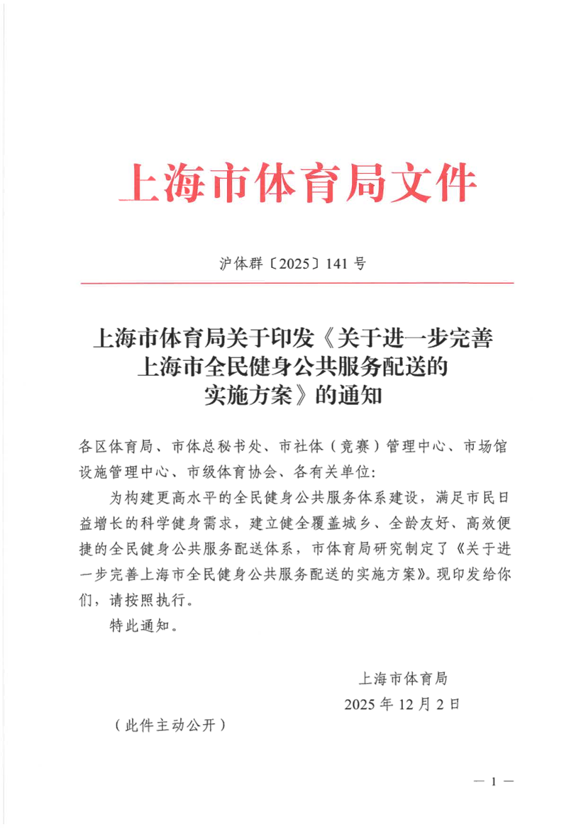 为构建更高水平的全民健身公共服务体系建设,满足市民日益增长的科学健身需求,建立健全覆盖城乡、全龄友好、高效便捷的全民健身公共服务配送体系,市体育局研究制定了《关于进一步完善上海市全民健身公共服务配送的实施方案》。现印发给你们,请按照执行。