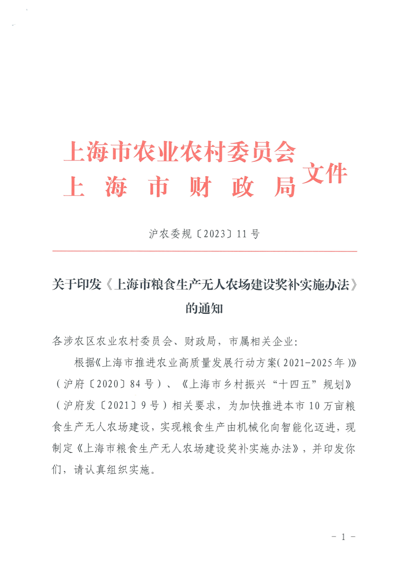 根据《上海市推进农业高质量发展行动方案(2021-2025年)》(沪府〔2020〕84号)、《上海市乡村振兴“十四五”规划》(沪府发〔2021〕9号)相关要求,为加快推进本市10万亩粮食生产无人农场建设,实现粮食生产由机械化向智能化迈进,现制定《上海市粮食生产无人农场建设奖补实施办法》,并印发你们,请认真组织实施。