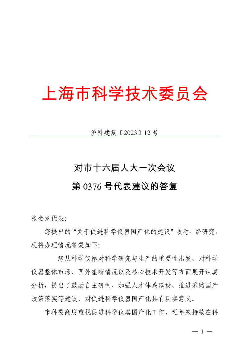 您提出的“关于促进科学仪器国产化的建议”收悉,经研究,现将办理情况答复如下: