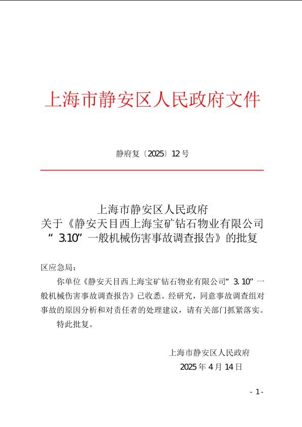 你单位《静安天目西上海宝矿钻石物业有限公司“3.10”一般机械伤害事故调查报告》已收悉。经研究,同意事故调查组对事故的原因分析和对责任者的处理建议,请有关部门抓紧落实。