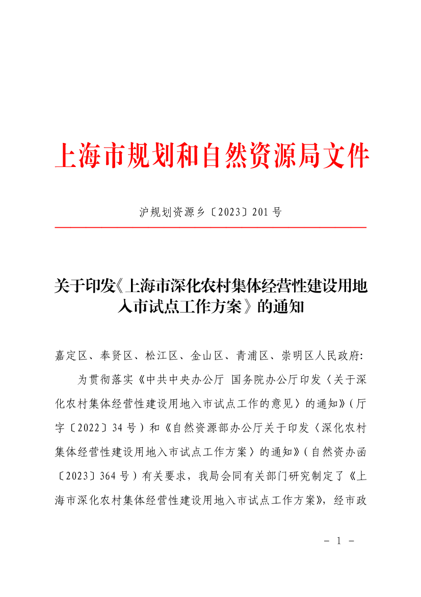为贯彻落实《中共中央办公厅 国务院办公厅印发〈关于深化农村集体经营性建设用地入市试点工作的意见〉的通知》(厅字〔2022〕34号)和《自然资源部办公厅关于印发〈深化农村集体经营性建设用地入市试点工作方案〉的通知》(自然资办函〔2023〕364号)有关要求,我局会同有关部门研究制定了《上海市深化农村集体经营性建设用地入市试点工作方案》,经市政府常务会议审议通过,现印发给你们,请认真按照执行。