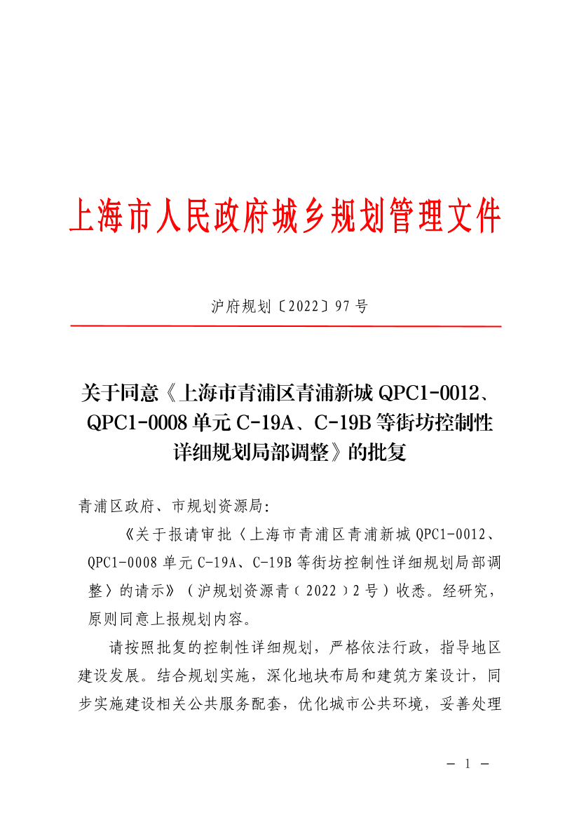 《关于报请审批〈上海市青浦区青浦新城QPC1-0012、QPC1-0008单元C-19A、C-19B等街坊控制性详细规划局部调整〉的请示》(沪规划资源青﹝2022﹞2号)收悉。经研究,原则同意上报规划内容。