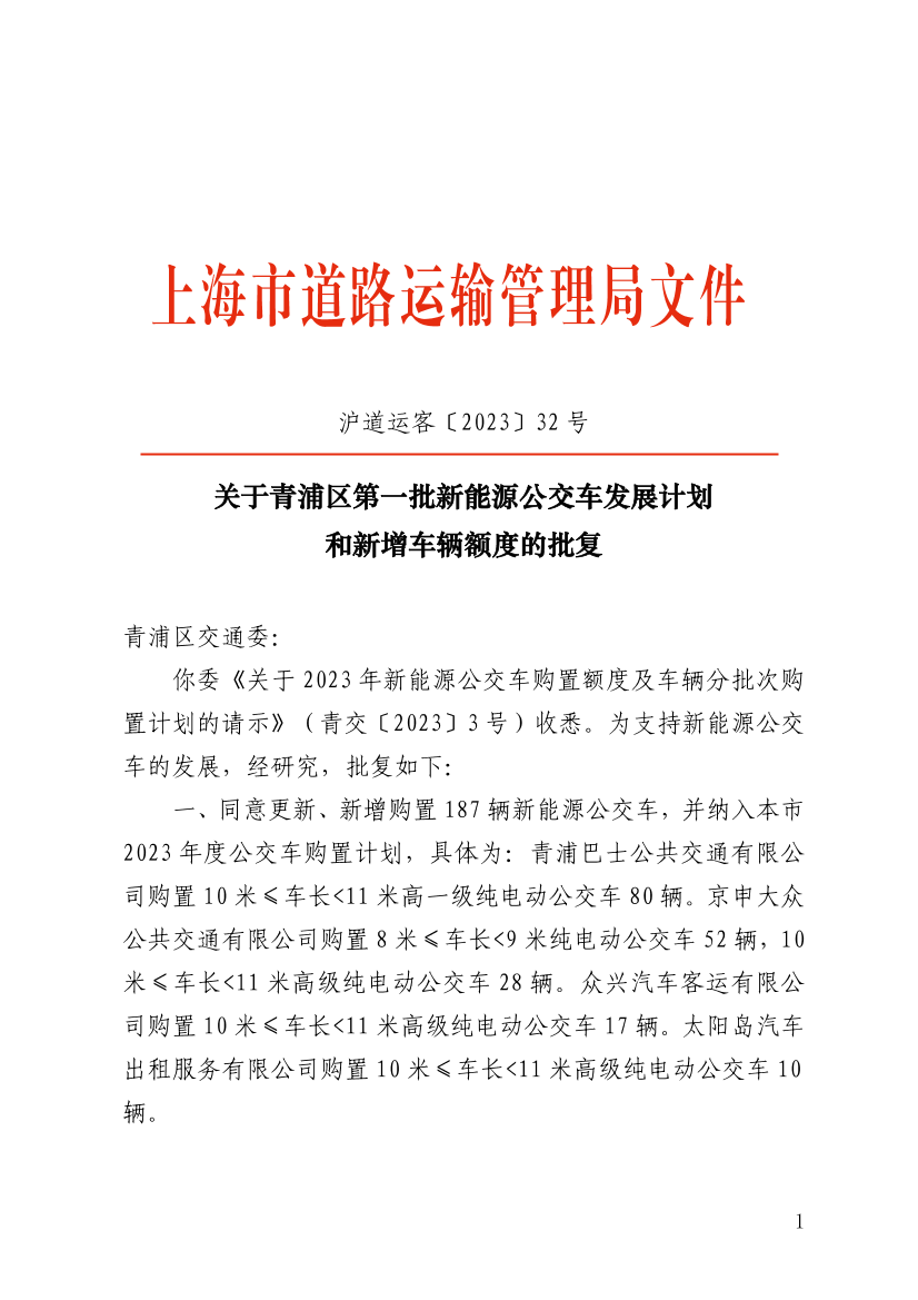 一、同意更新、新增购置187辆新能源公交车,并纳入本市2023年度公交车购置计划,具体为:青浦巴士公共交通有限公司购置10米≤车长<11米高一级纯电动公交车80辆。京申大众公共交通有限公司购置8米≤车长<9米纯电动公交车52辆,10米≤车长<11米高级纯电动公交车28辆。众兴汽车客运有限公司购置10米≤车长<11米高级纯电动公交车17辆。太阳岛汽车出租服务有限公司购置10米≤车长<11米高级纯电动公交车10辆。