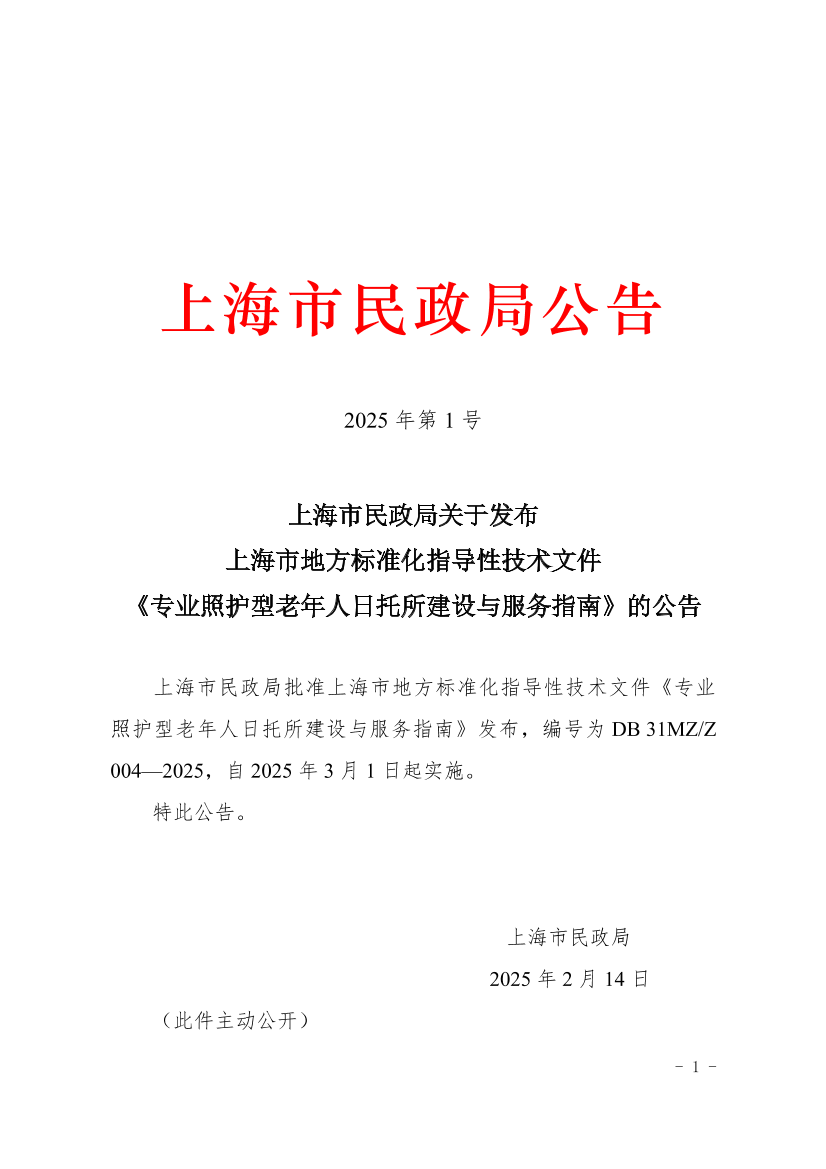 上海市民政局批准上海市地方标准化指导性技术文件《专业照护型老年人日托所建设与服务指南》发布,编号为DB 31MZ/Z 004—2025,自2025年3月1日起实施。