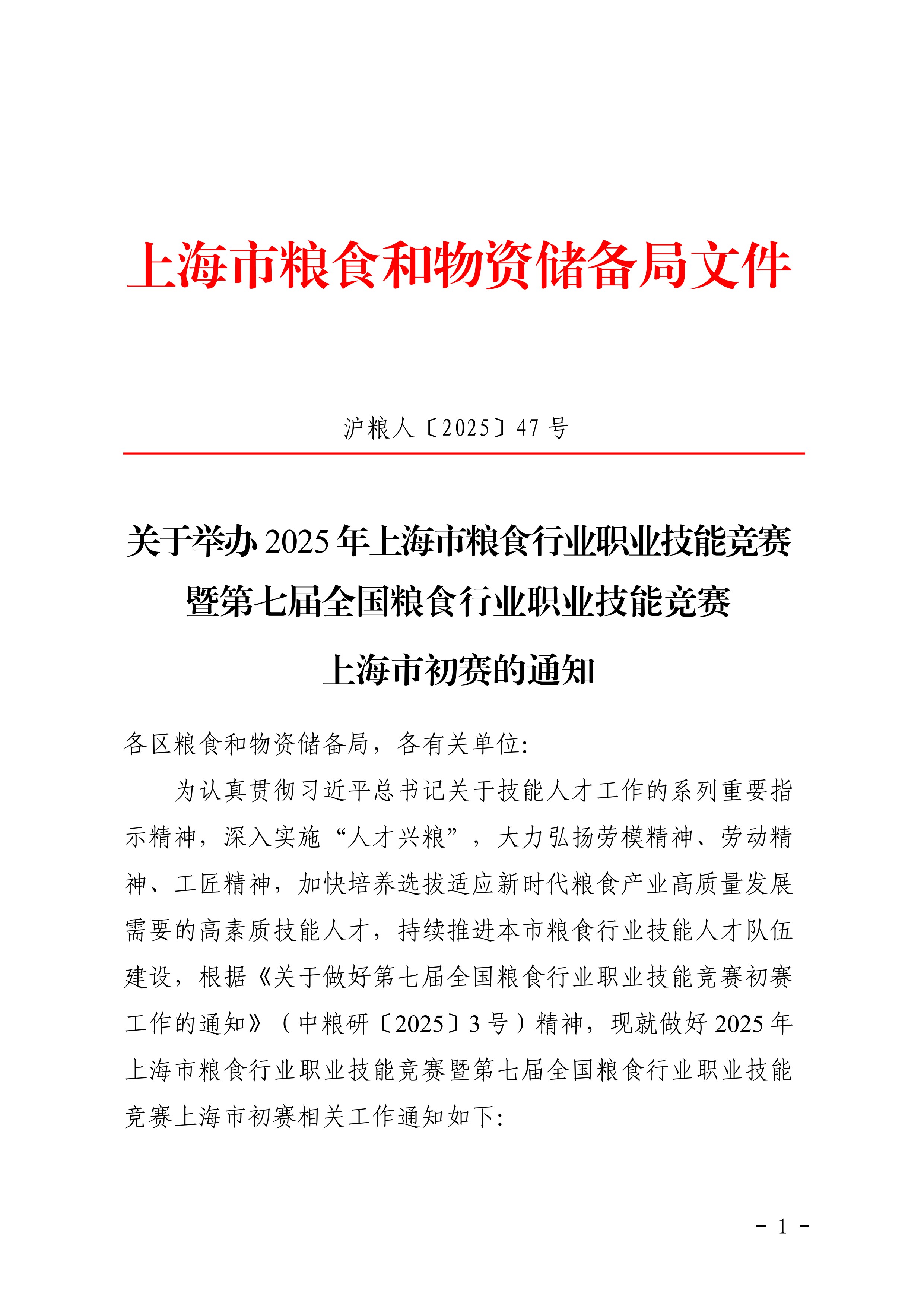 为认真贯彻习近平总书记关于技能人才工作的系列重要指示精神,深入实施“人才兴粮”,大力弘扬劳模精神、劳动精神、工匠精神,加快培养选拔适应新时代粮食产业高质量发展需要的高素质技能人才,持续推进本市粮食行业技能人才队伍建设,根据《关于做好第七届全国粮食行业职业技能竞赛初赛工作的通知》(中粮研〔2025〕3号)精神,现就做好2025年上海市粮食行业职业技能竞赛暨第七届全国粮食行业职业技能竞赛上海市初赛相关工作通知如下: