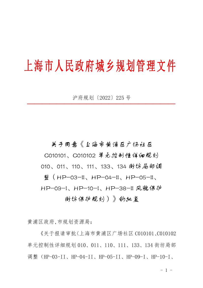 《关于报请审批〈上海市黄浦区广场社区C010101、C010102单元控制性详细规划010、011、110、111、133、134街坊局部调整(HP-03-II、HP-04-II、HP-05-II、HP-09-I、HP-10-I、HP-38-II风貌保护街坊保护规划)〉的请示》(沪黄府规划〔2022〕8号)收悉。经研究,原则同意上报规划内容。