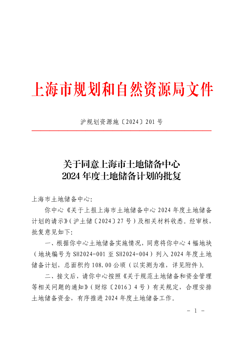 一、根据你中心土地储备实施情况,同意将你中心4幅地块(地块编号为SH2024-001至SH2024-004)列入2024年度土地储备计划,总面积约108.00公顷(以实测为准,详见附件)。