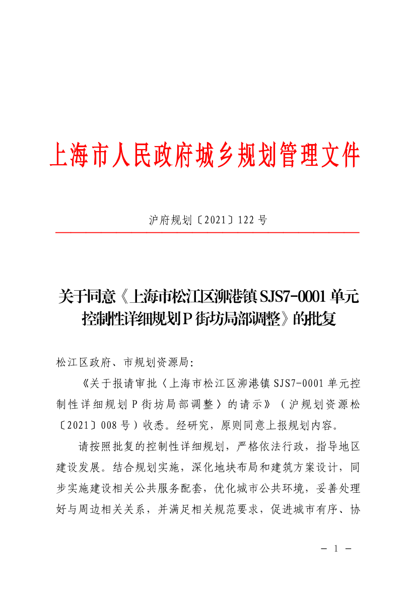《关于报请审批〈上海市松江区泖港镇SJS7-0001单元控制性详细规划P街坊局部调整〉的请示》(沪规划资源松〔2021〕008号)收悉。经研究,原则同意上报规划内容。