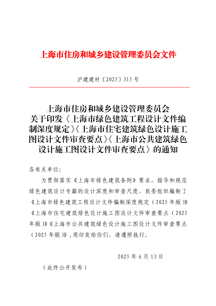 为贯彻落实《上海市绿色建筑条例》要求,指导和规范绿色建筑设计专篇的设计深度和审查尺度,我委组织编制了《上海市绿色建筑工程设计文件编制深度规定(2025年版)》《上海市住宅建筑绿色设计施工图设计文件审查要点(2025年版)》《上海市公共建筑绿色设计施工图设计文件审查要点(2025年版)》,现印发给你们,请遵照执行。