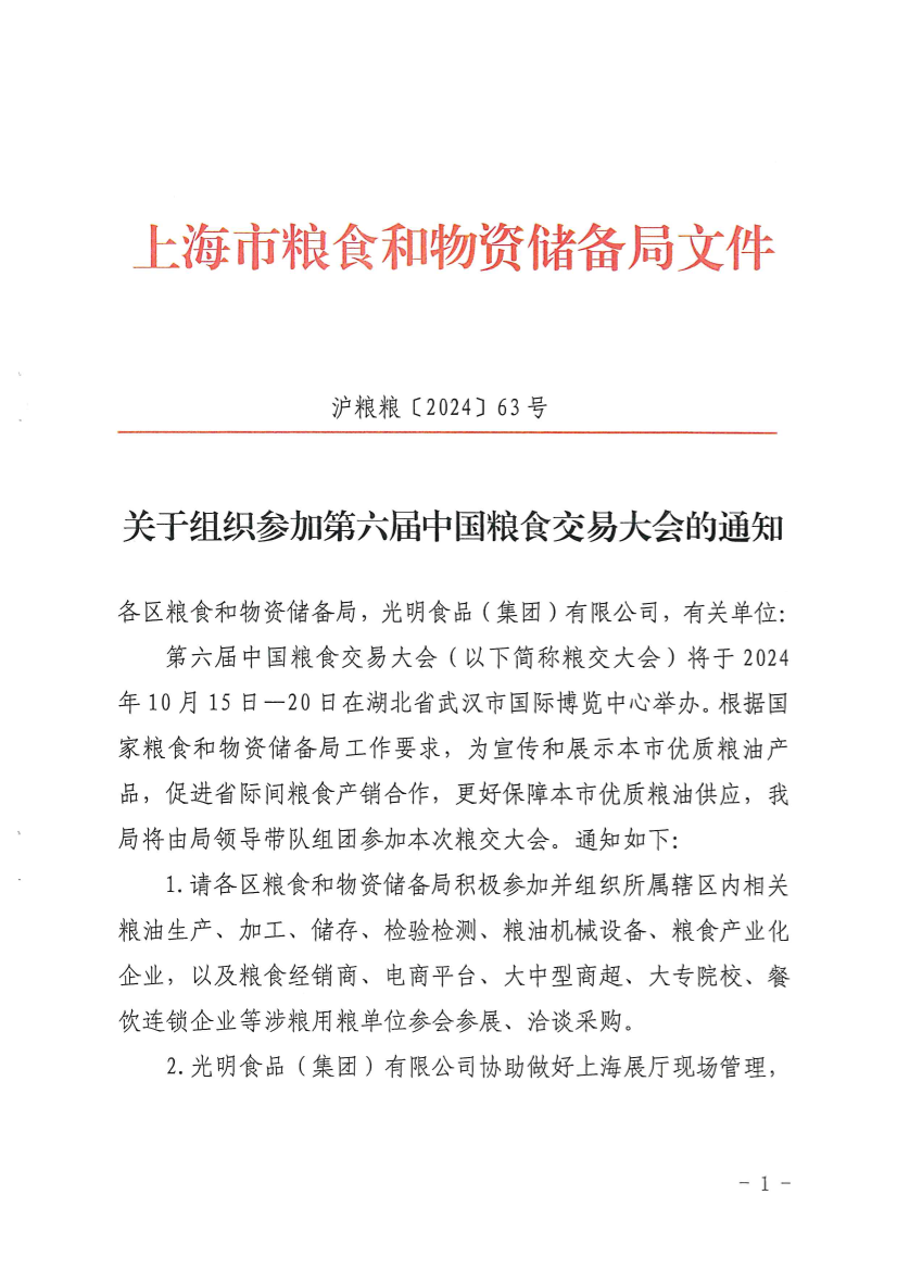 第六届中国粮食交易大会(以下简称粮交大会)将于2024年10月15日—20日在湖北省武汉市国际博览中心举办。根据国家粮食和物资储备局工作要求,为宣传和展示本市优质粮油产品,促进省际间粮食产销合作,更好保障本市优质粮油供应,我局将由局领导带队组团参加本次粮交大会。通知如下: