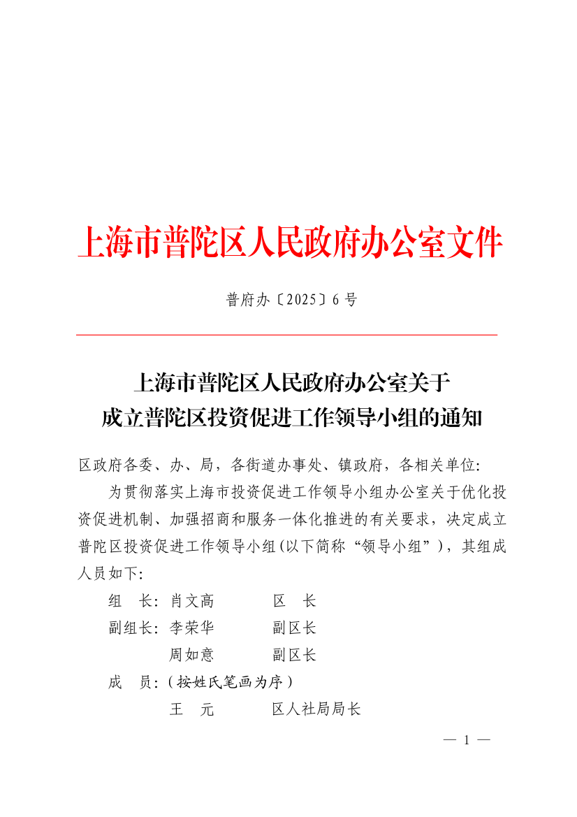为贯彻落实上海市投资促进工作领导小组办公室关于优化投资促进机制、加强招商和服务一体化推进的有关要求,决定成立普陀区投资促进工作领导小组(以下简称“领导小组”),其组成人员如下: