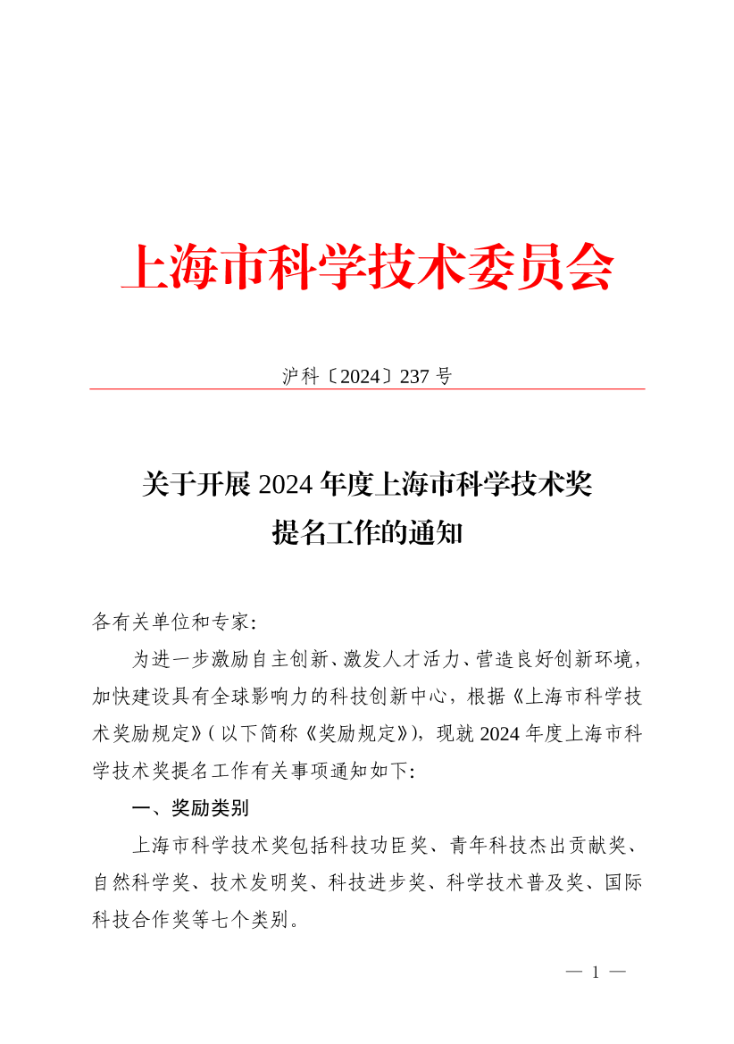 为进一步激励自主创新、激发人才活力、营造良好创新环境,加快建设具有全球影响力的科技创新中心,根据《上海市科学技术奖励规定》(以下简称《奖励规定》),现就2024年度上海市科学技术奖提名工作有关事项通知如下: