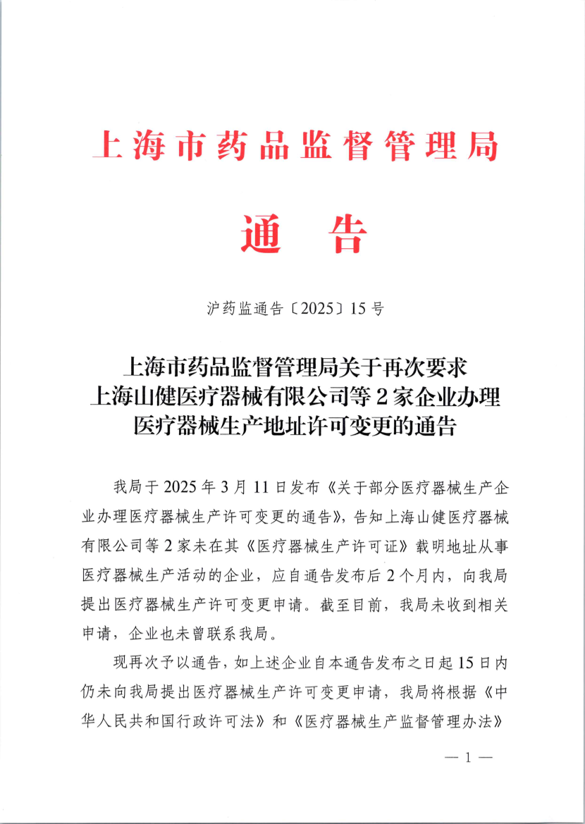 我局于2025年3月11日发布《关于部分医疗器械生产企业办理医疗器械生产许可变更的通告》,告知上海山健医疗器械有限公司等2家未在其《医疗器械生产许可证》载明地址从事医疗器械生产活动的企业,应自通告发布后2个月内,向我局提出医疗器械生产许可变更申请。截至目前,我局未收到相关申请,企业也未曾联系我局。