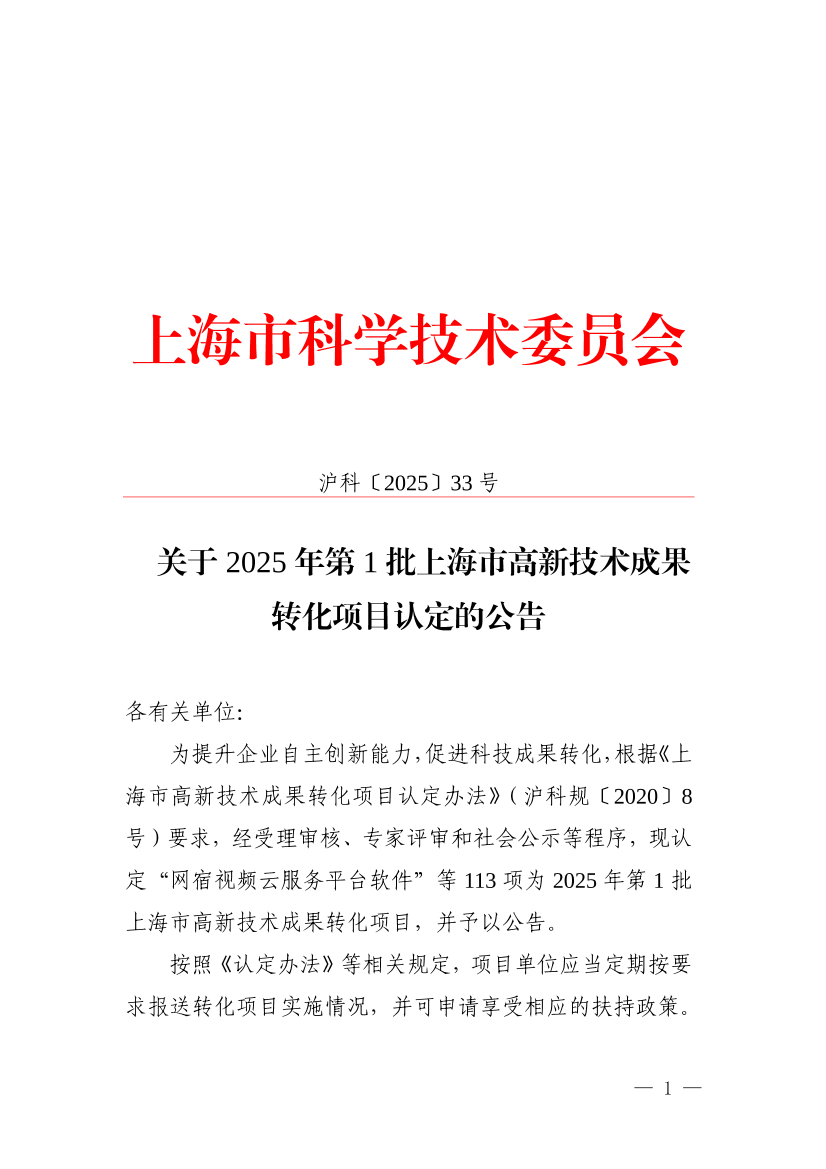 为提升企业自主创新能力,促进科技成果转化,根据《上海市高新技术成果转化项目认定办法》(沪科规〔2020〕8号)要求,经受理审核、专家评审和社会公示等程序,现认定“网宿视频云服务平台软件”等113项为2025年第1批上海市高新技术成果转化项目,并予以公告。