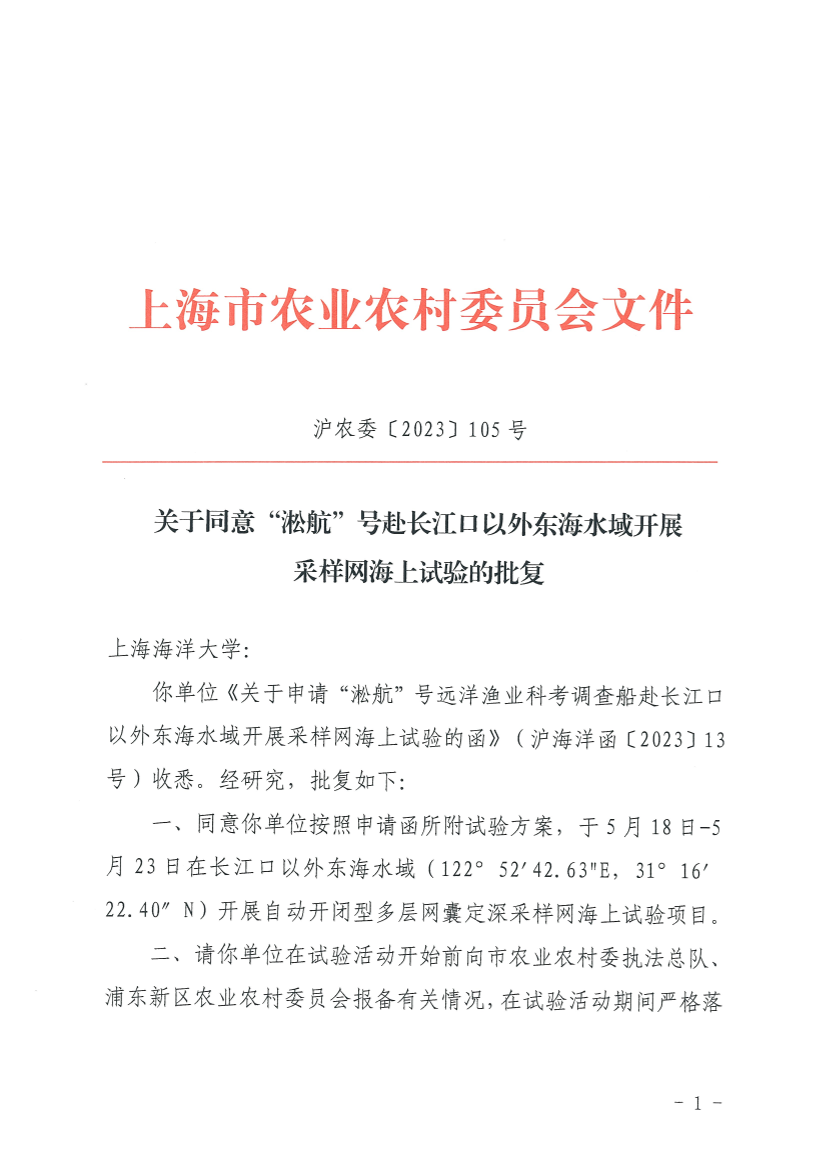 一、同意你单位按照申请函所附试验方案,于5月18日-5月23日在长江口以外东海水域(122°52'42.63"E,31°16′22.40″N)开展自动开闭型多层网囊定深采样网海上试验项目。