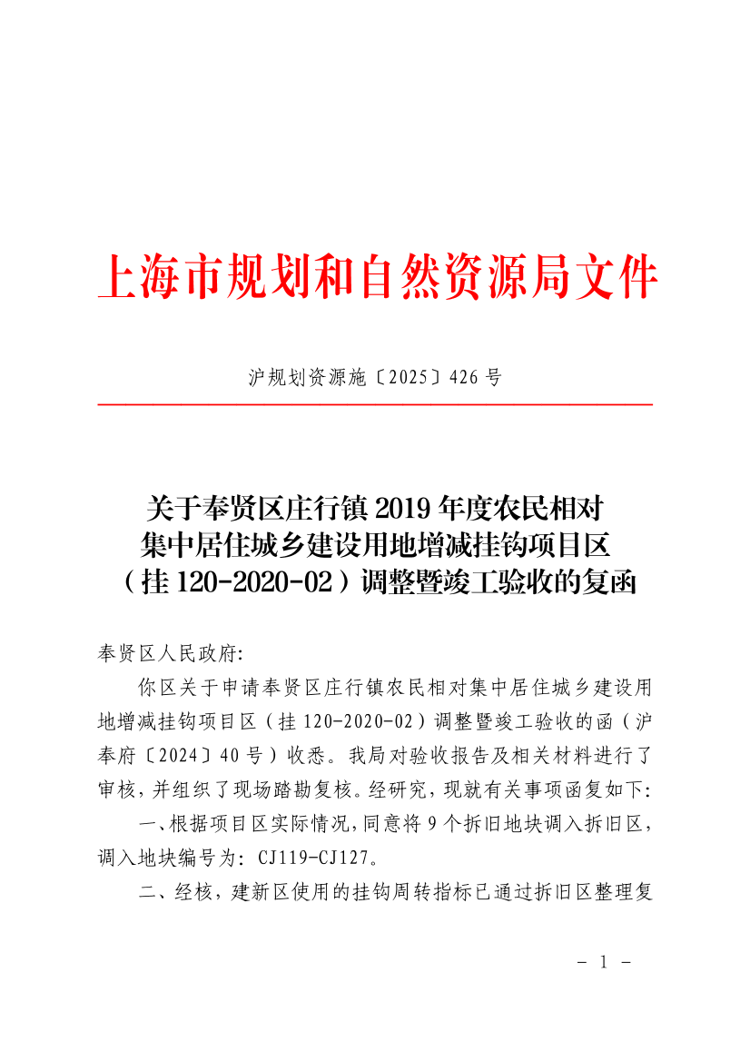 你区关于申请奉贤区庄行镇农民相对集中居住城乡建设用地增减挂钩项目区(挂120-2020-02)调整暨竣工验收的函(沪奉府〔2024〕40号)收悉。我局对验收报告及相关材料进行了审核,并组织了现场踏勘复核。经研究,现就有关事项函复如下: