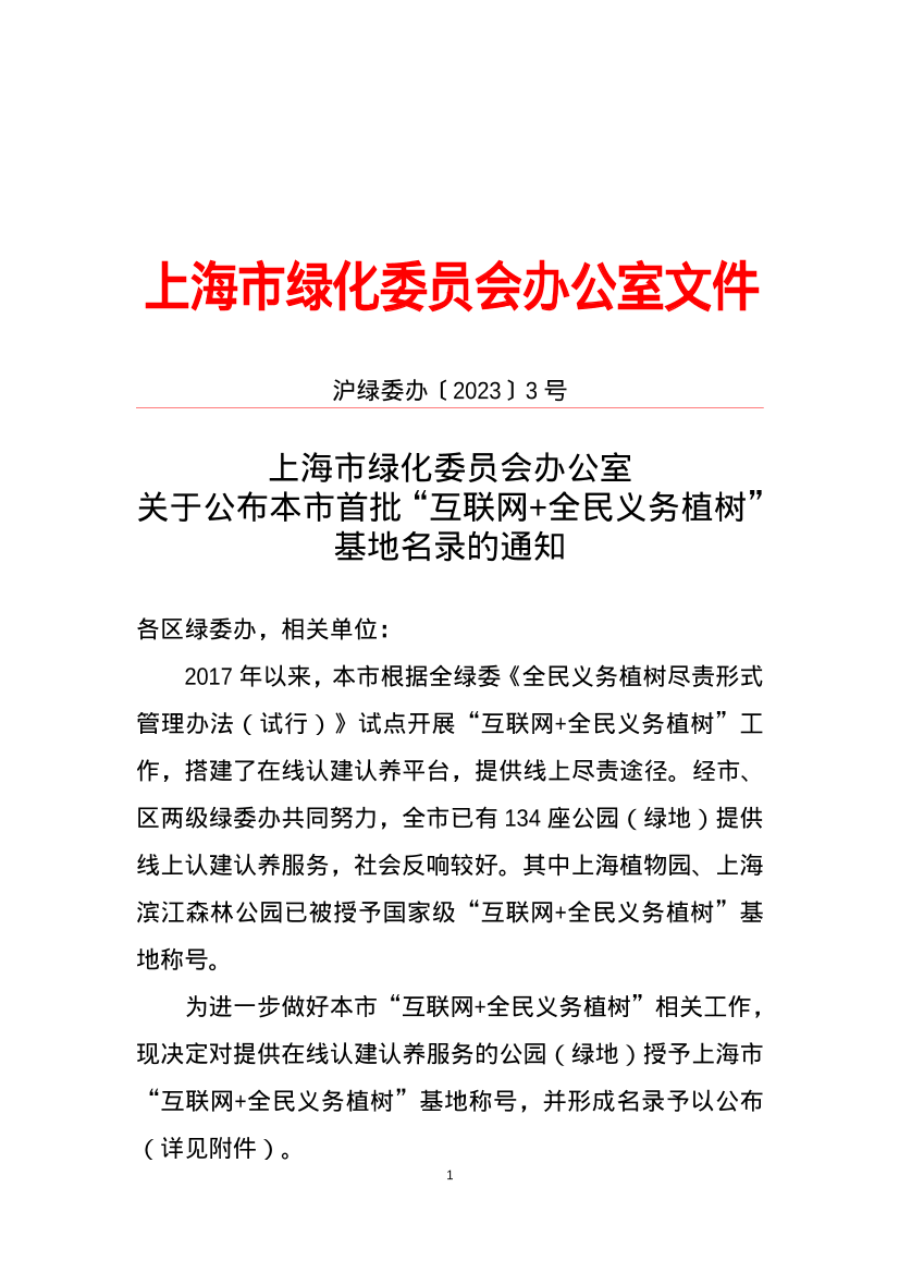 为进一步做好本市“互联网+全民义务植树 ”相关工作, 现决定对提供在线认建认养服务的公园(绿地)授予上海市 “互联网+全民义务植树 ”基地称号,并形成名录予以公布(详见附件)。