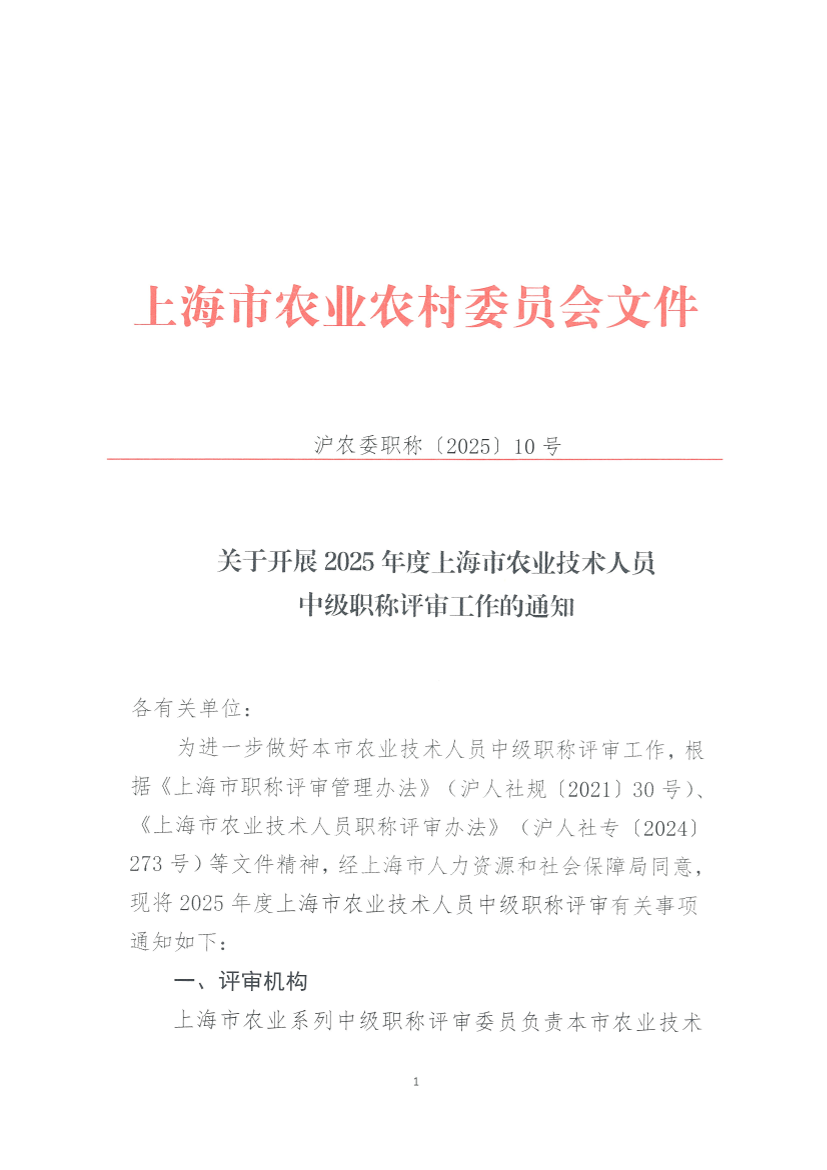 为进一步做好本市农业技术人员中级职称评审工作,根据《上海市职称评审管理办法》(沪人社规〔2021〕30号)、《上海市农业技术人员职称评审办法》(沪人社专〔2024〕273号)等文件精神,经上海市人力资源和社会保障局同意,现将2025年度上海市农业技术人员中级职称评审有关事项通知如下: