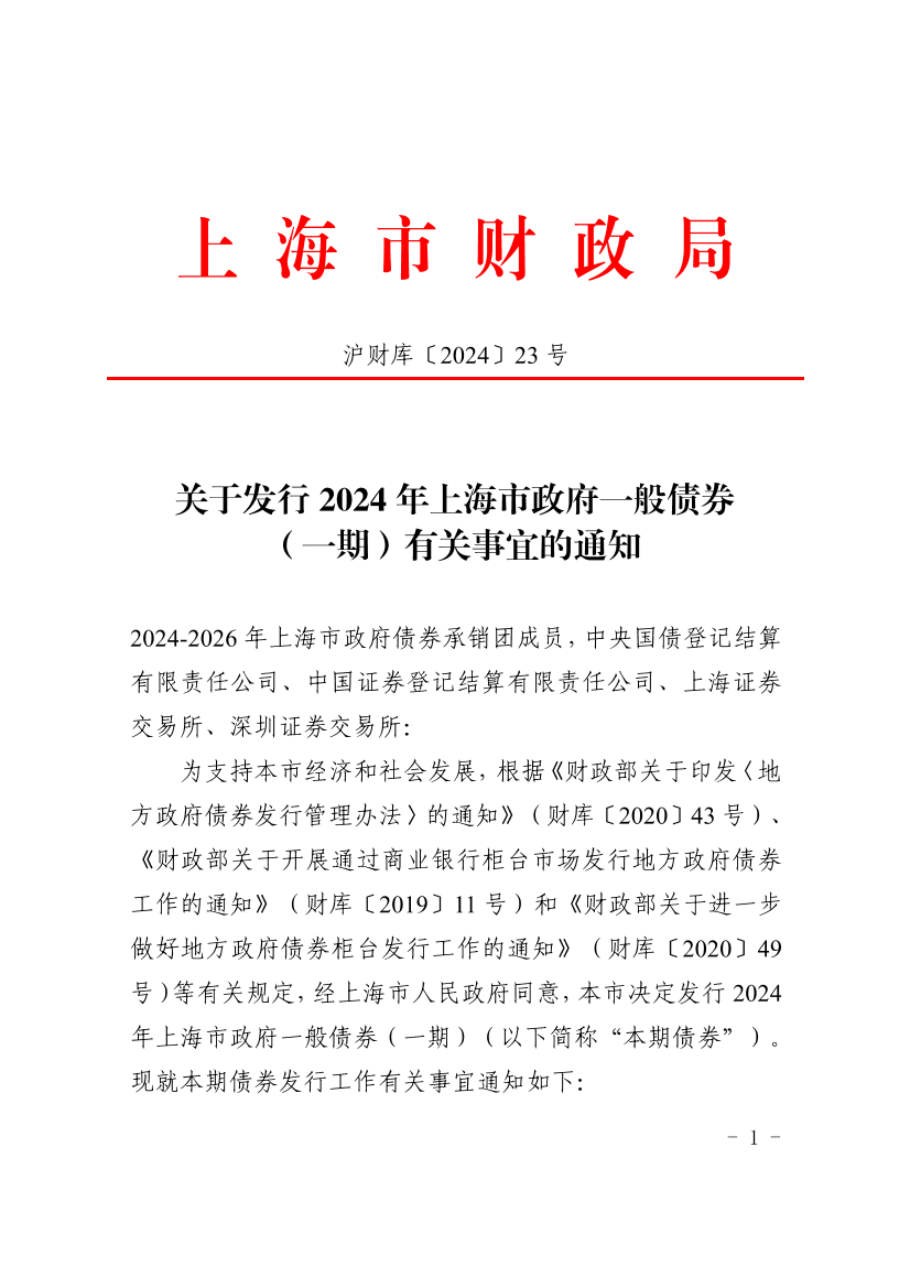 为支持本市经济和社会发展,根据《财政部关于印发〈地方政府债券发行管理办法〉的通知》(财库〔2020〕43号)、《财政部关于开展通过商业银行柜台市场发行地方政府债券工作的通知》(财库〔2019〕11号)和《财政部关于进一步做好地方政府债券柜台发行工作的通知》(财库〔2020〕49号)等有关规定,经上海市人民政府同意,本市决定发行2024年上海市政府一般债券(一期)(以下简称“本期债券”)。现就本期债券发行工作有关事宜通知如下: