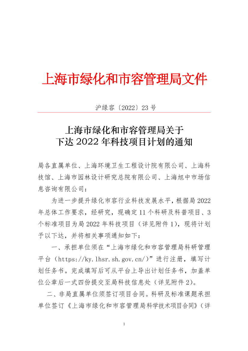 为进一步提升绿化市容行业科技发展水平,根据局2022年总体工作要求,经研究,现确定11个科研及科普项目、3个标准项目为局2022年科技项目(详见附件1),现将计划予以下达,并将相关事项通知如下: