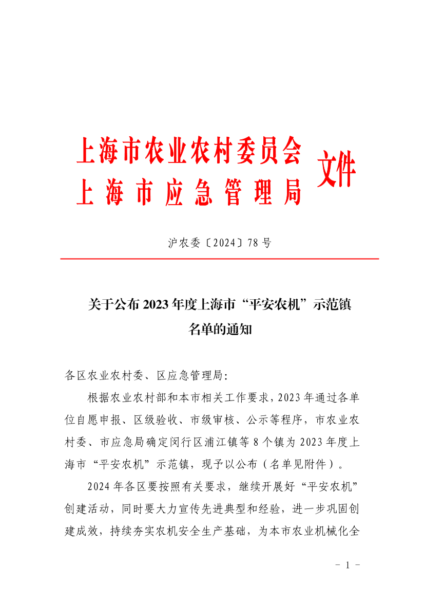 根据农业农村部和本市相关工作要求,2023年通过各单位自愿申报、区级验收、市级审核、公示等程序,市农业农村委、市应急局确定闵行区浦江镇等8个镇为2023年度上海市“平安农机”示范镇,现予以公布(名单见附件)。