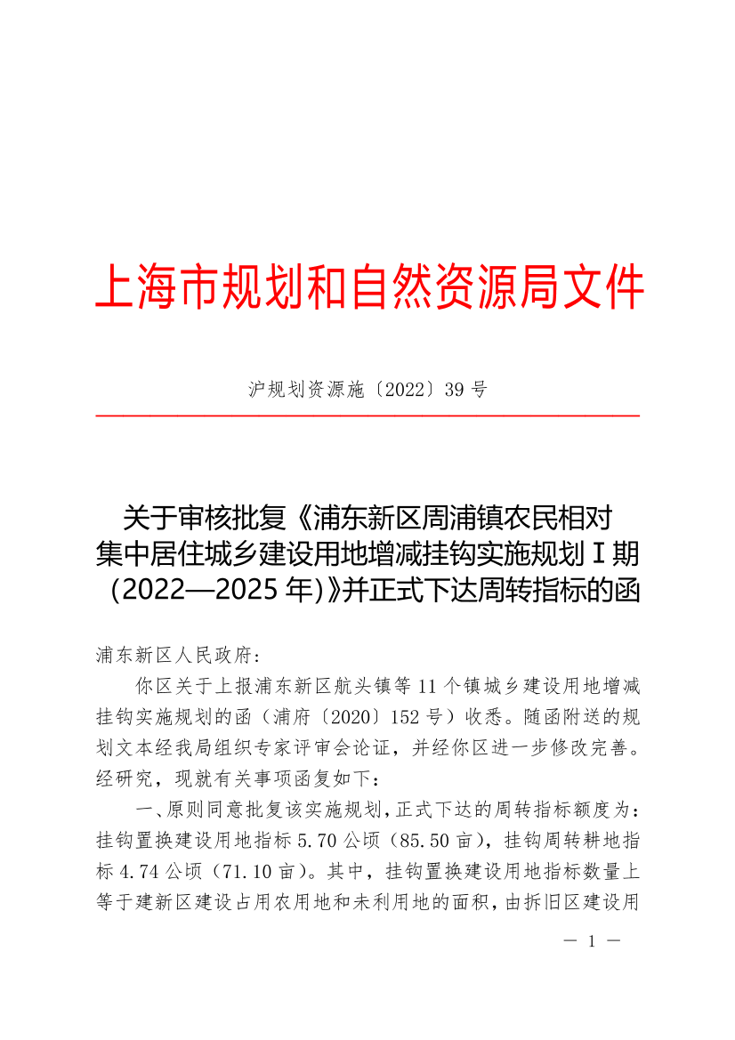 浦东新区周浦镇农民相对集中居住城乡建设用地增减挂钩 实施规划Ⅰ期(2022-2025年) |