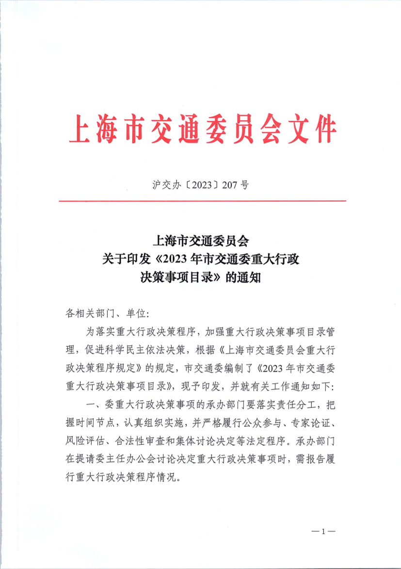 为落实重大行政决策程序,加强重大行政决策事项目录管理,促进科学民主依法决策,根据《上海市交通委员会重大行政决策程序规定》的规定,市交通委编制了《2023年市交通委重大行政决策事项目录》,现予印发,并就有关工作通知如下: