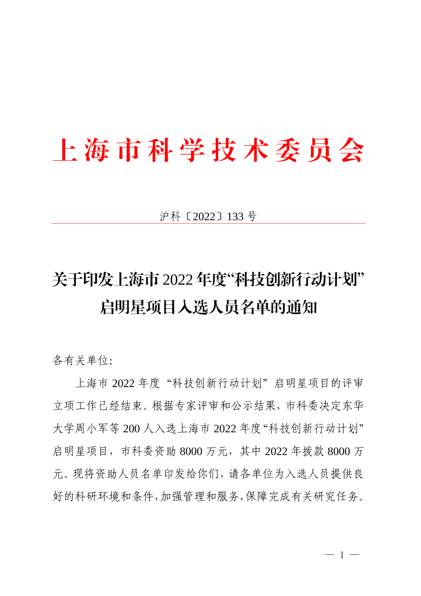 上海市2022年度“科技创新行动计划”启明星项目的评审立项工作已经结束。根据专家评审和公示结果,市科委决定东华大学周小军等200人入选上海市2022年度“科技创新行动计划”启明星项目,市科委资助8000万元,其中2022年拨款8000万元。现将资助人员名单印发给你们,请各单位为入选人员提供良好的科研环境和条件,加强管理和服务,保障完成有关研究任务。